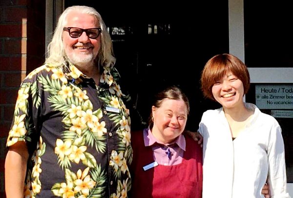 スタッドハウスホテルで働くクラウディアさん(中)と筆者(右)