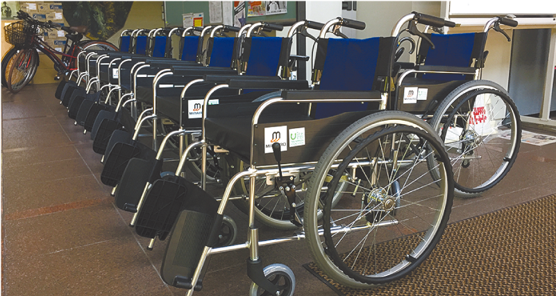 4月14日に発生した熊本地震を受け、ミライロでは2度にわたり現地への物資支援を実施。第1回は、4月25・26日。九州営業所(福岡市)から2名のスタッフが、がれきに強いノーパンク車いすやステッキなどの福祉用品を益城町災害対策本部に届けた。その後、車いす利用者の避難を積極的に受け入れている熊本学園大学を訪問。障害者が何に困っているかを、サポート担当者にヒヤリング。「つえを自宅に置き忘れた方の移動が困難」「一人でトイレに行けない方は水を飲まずトイレを我慢しがち」「床ずれ防止のため寝返りをサポート」などの声を聞くことができた。
