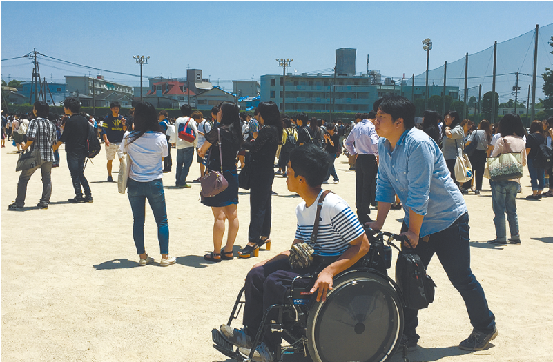 第2回は5月23日、日本財団の助成事業として実施、熊本学園大学ほか3カ所を訪問。同大学では、社会福祉学部を中心とした学生ボランティア60人体制で独自に避難所を開設、約30人の高齢者、障害者を含む700人余りを受け入れ、現在も約20人が避難生活をおくる。この日は避難訓練が行われ、障害のある学生20人を含む約3000人が参加。今回の地震で直面した「電動車いす利用者の避難方法」として、各フロアに設置された手動車いすに乗り換え、4人で担いで降ろす訓練を行った。障害のある学生の受け入れを先進的に行っている同大学では、施設だけでなく学生や教職員にもユニバーサルな意識が根付いていたことから、今回の支援が実現したと考えられる。